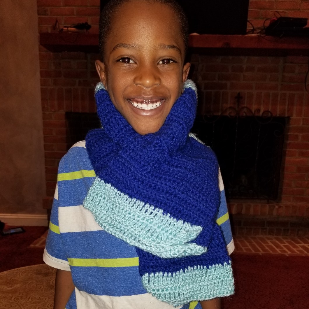 Baby boy’s scarf is all done! He was so proud when I worked on it. This smile says it all. I think the most rewarding thing is making little things for my family.
