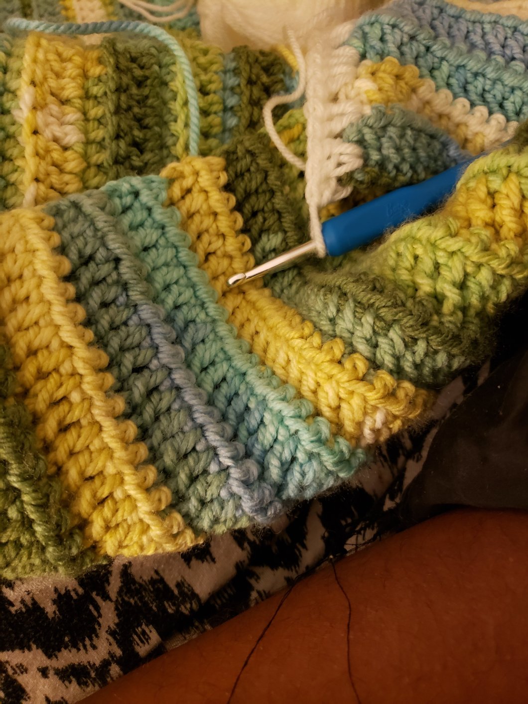 My husband says that when I crochet it makes him feel like cuddling me. His arm wrapped around me as I try to get this blanket done.